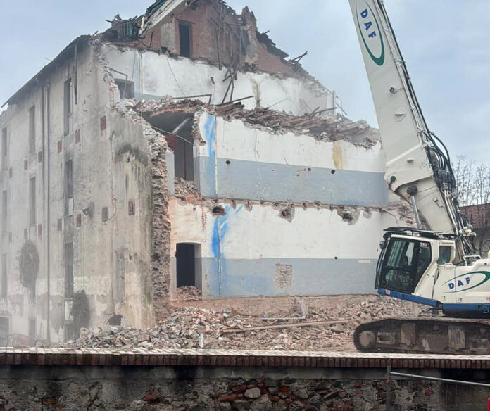 Avanza la demolizione dell’edificio storico per fare spazio al nuovo polo culturale. Dalle gru alle macerie: un simbolo urbano che cambia volto.